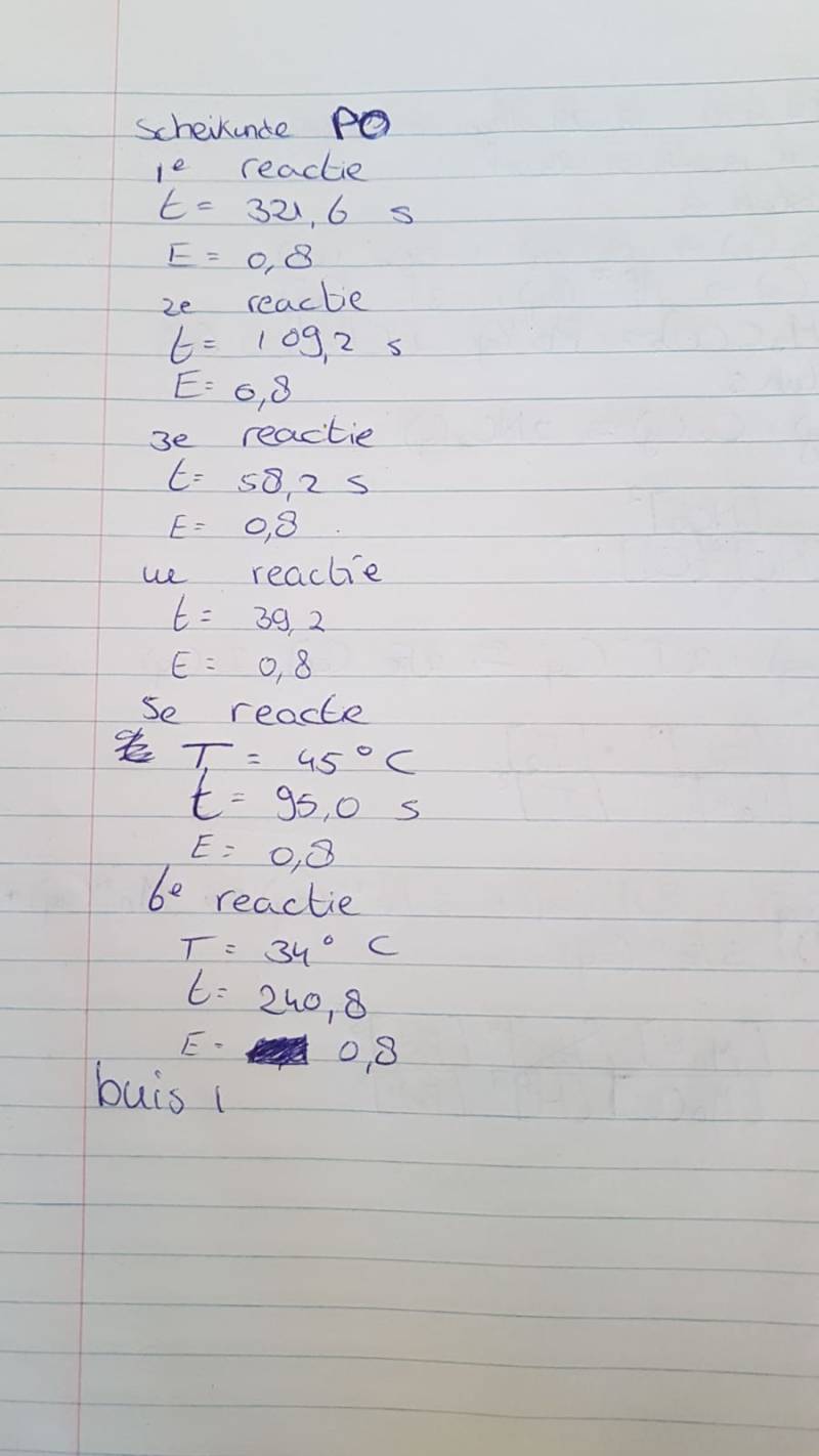 We hebben naast de concentratie van thiosulfaat ook de wachttijd in de tabel gezet. Deze wachttijd geeft aan hoe lang het duurde voordat de reactie een E van 0,8 heeft bereikt.